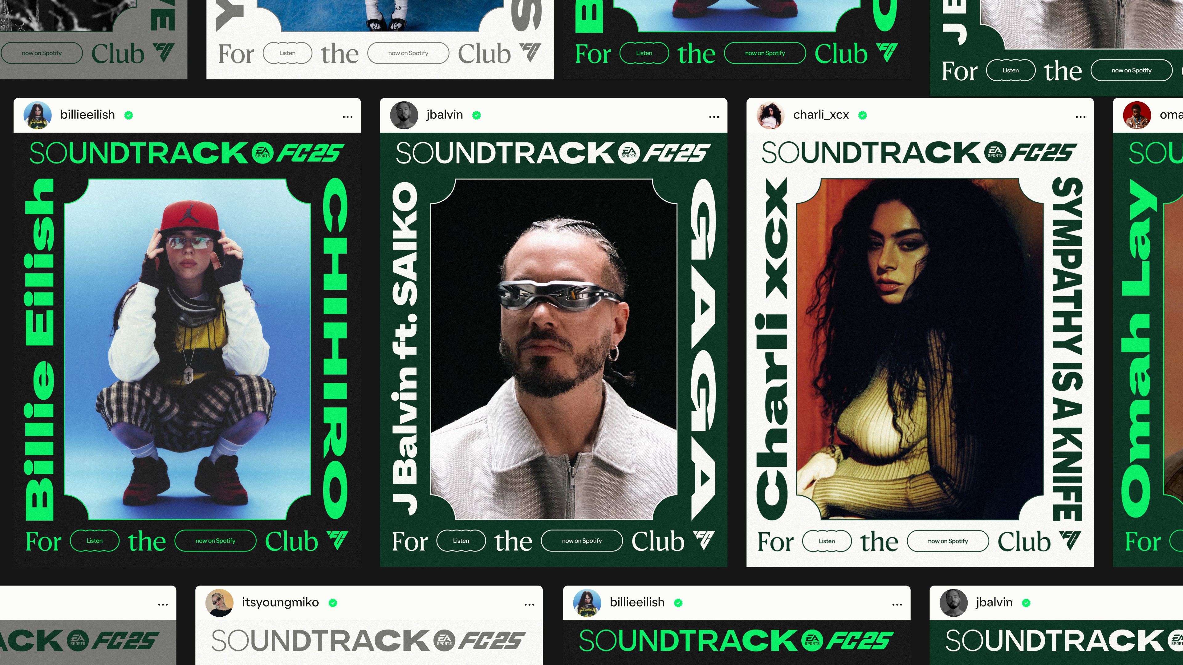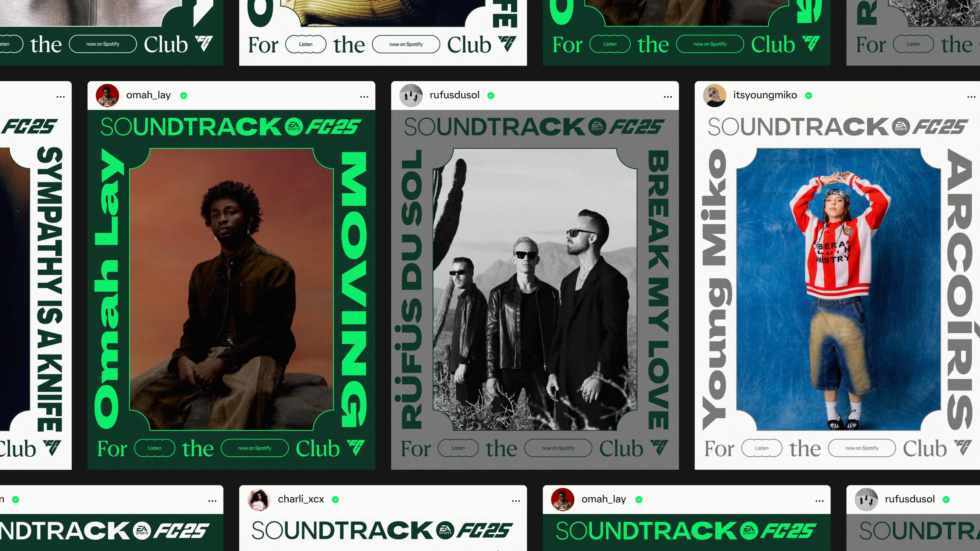 for ea sports fc 25, we developed a visual identity for the soundtrack — a system designed to introduce artists into the global conversation, while continuing a legacy of discovery. we were inspired by soccer sticker albums, a format deeply rooted in brazilian culture, where repetition builds meaning over time. we translated this into a flexible visual system: cutout masks, color and space that allow each artist to exist with clarity. the result is a structure that adapts across artists, formats and moments. this work positions the soundtrack as part of that system.